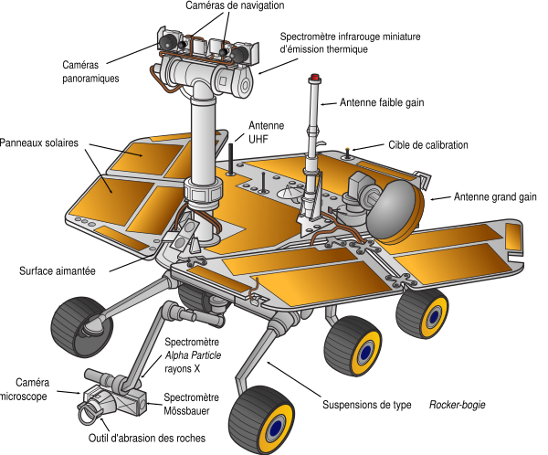 Марсоход имеет 6 колёс. Источником электроэнергии служат солнечные батареи мощностью до 140 ватт[3]. При массе в 185 кг марсоход оснащён шлифовальным станком, несколькими камерами, микрокамерой (MI) и двумя спектрометрами, смонтированными на манипуляторе[4][5].