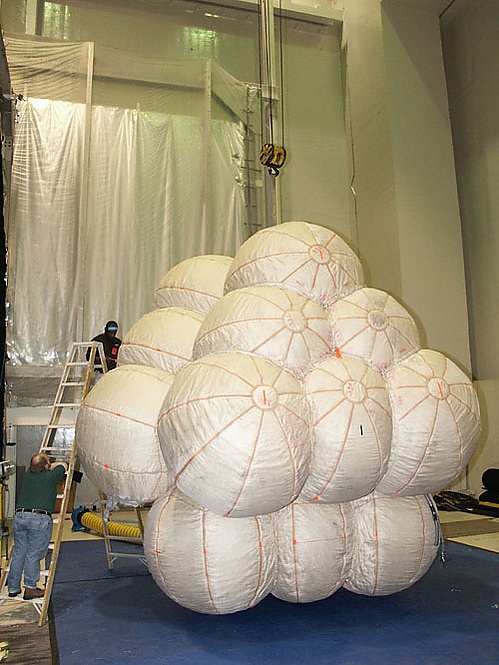 Подушки безопасности также были усовершенствованы, данная технология смягчения приземления аппарата применялась в миссии Mars Pathfinder. Вокруг посадочного модуля, содержавшего марсоход, находились двадцать четыре надутых ячейки. Подушки безопасности созданы из очень прочного синтетического материала, называемого «Vectran». Этот же материал используется для изготовления скафандров. Опять же, с увеличением веса космического аппарата необходимо было создать более прочные подушки безопасности. Несколько тестов на падение показали, что дополнительная масса вызывает серьёзные повреждения и разрыв материала. Инженеры разработали двойную оболочку из подушек безопасности, призванные предотвратить серьёзные повреждения при высокоскоростной посадке, когда подушки безопасности могут соприкоснуться с острыми камнями и другими геологическими особенностями Красной планеты.[13]