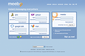 meebo — закрытый после продажи Google веб-сервис для мгновенного обмена сообщениями (Instant Messaging, IM). Предоставляет доступ к следующим IM-сетям: AIM, Yahoo!, MSN, Google Talk, Facebook, MySpace, ICQ, XMPP (Jabber), Flixster, eBaum’s World и др. Для обмена сообщениями с помощью meebo не требуется установка дополнительных программ, достаточно иметь браузер. Сайт использует технологию Ajax и библиотеку libpurple с открытым исходным кодом, которую создали разработчики программы Pidgin.