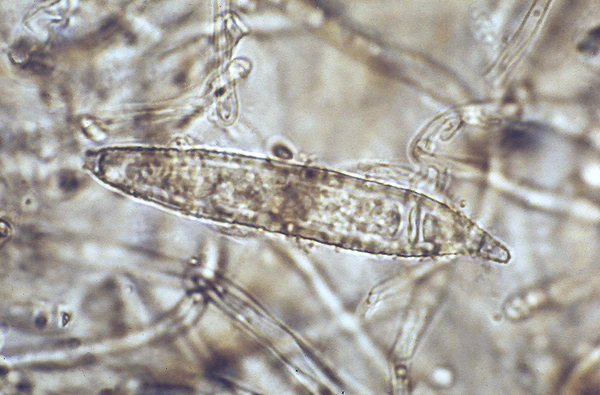 - Микроконидии также встречаются редко. Если они присутствуют, то одноклеточные, булавовидной или грушевидной формы, и располагаются по бокам гиф.