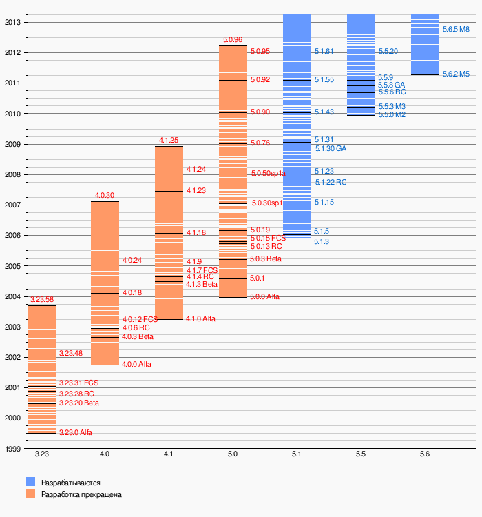 - Версия 5.6: в разработке (последний релиз — 5.6.50 от 19.10.2020)[23].