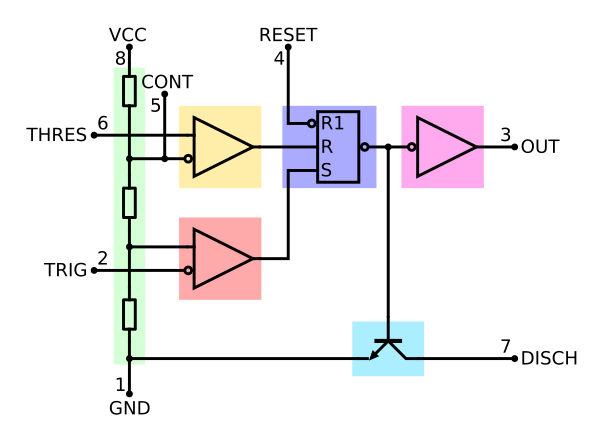Представляет собой асинхронный RS-триггер со специфическими порогами входов, точно заданными аналоговыми компараторами и встроенным делителем напряжения.
