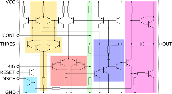 Микросхема состоит из делителя напряжения с двумя опорными напряжениями для сравнения, двух прецизионных компараторов (низкого и высокого уровней), RS-триггера с дополнительным входом сброса, транзисторного ключа с открытым коллектором и выходного усилителя мощности для увеличения нагрузочной способности.