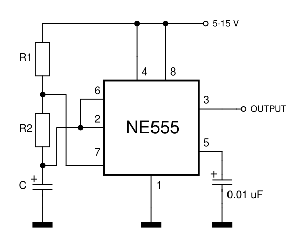 Если необходимая длительность низкого уровня больше длительности высокого (скважность больше 2) необходимо дополнить приведённую схему диодом, анод которого подключен к выводу 7, а катод к выводу 6 микросхемы NE555. В этом случае конденсатор С будет заряжаться через резистор R1 (а R2 при этом будет накоротко замкнут диодом) и длительность высокого уровня будет определяться формулой