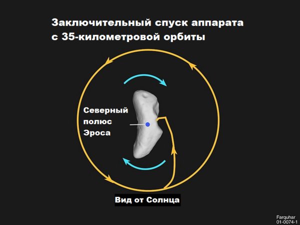 1 апреля 2000 года «NEAR Shoemaker» начал следующий этап сближения с Эросом, для более детального его изучения. 11 апреля аппарат вышел на круговую орбиту, на расстояние около 100 км[24].
