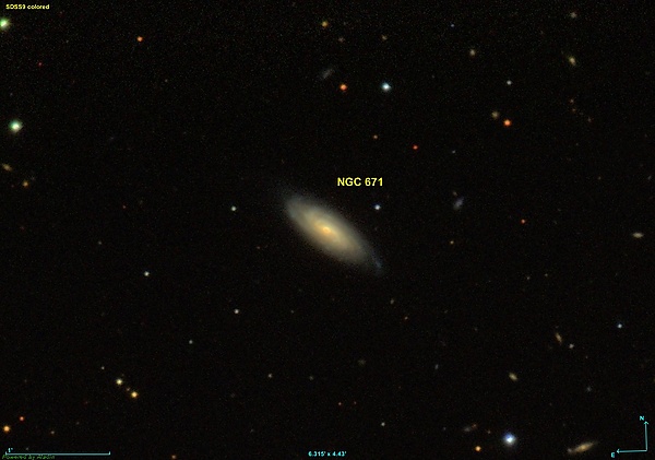 NGC 671 (другие обозначения — UGC 1247, MCG 2-5-29, ZWG 437.27, IRAS01443+1252, PGC 6546) — галактика в созвездии Овен. Открыта Льюисом Свифтом в 1885 году. Описание Дрейера: «очень тусклый, довольно маленький объект круглой формы, расположен между звездой и двойной звездой». Эта галактика принадлежит к числу сейфертовских галактик[6].