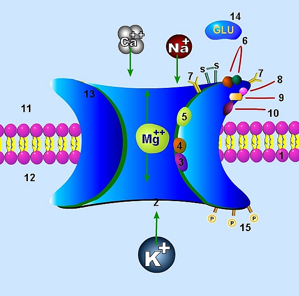 Ион магния удаляется при деполяризации постсинаптической мембраны, на которой находится рецептор. Одновременно с этим для функционирования рецептора должен поступить в синаптическую щель глутамат. Такая активация рецептора вызывает открытие ионного канала, селективного к катионам, что ведёт к притоку в клетку Na+ и, в небольшом объёме, Ca2+, а K+ покидает клетку. Ионы кальция, вошедшие через канал, активируют протеинкиназу CaMK-II. Происходит её аутофосфорилирование и фосфорилирование ряда белков нейрона-реципиента.
