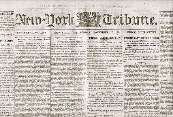 «Нью-Йорк трибюн»[3] (анг. «New-York Tribune» переводится как «Нью-йоркская трибуна») — американская ежедневная газета, впервые издававшаяся журналистом и политиком Хорасом Грили с 1841 года. В 1842—1866 называлась «New-York Daily Tribune». Определённый период времени занимала лидирующие позиции среди американских печатных СМИ. В 1924 году объединилась с «New York Herald», в результате чего был образован ежедневник «New York Herald Tribune». Последний издавался до 1967 года.