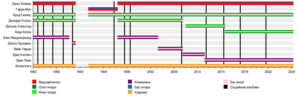 - Джек Блэйдс — бас-гитара, вокал и бэк-вокал, акустическая гитара, ритм-гитара (1979—1989, 1996 — настоящее время)