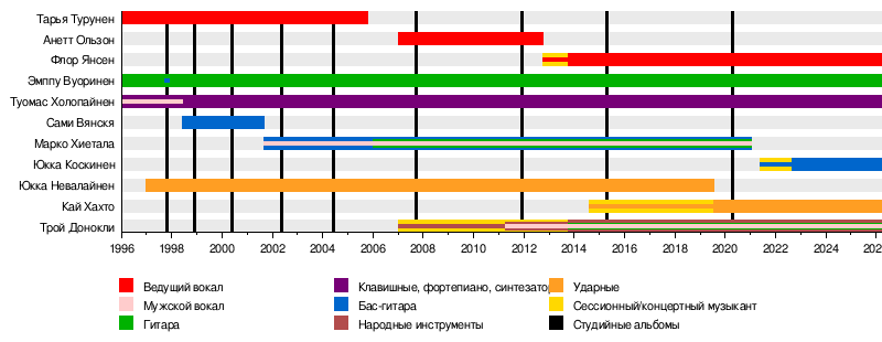 - Туомас Холопайнен — клавишные, фортепиано, синтезаторы (1996 — наши дни), мужской вокал (1996—1998)
