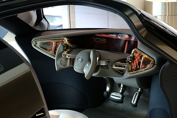 Интерьер автомобиля очень необычный по своей компоновке: место водителя находится спереди по центру, чуть сзади по бокам расположены два пассажирских, а сзади места водителя расположено дополнительное складное сидение. Руль выполнен в виде штурвала у гоночных автомобилей. Панель приборов огибает рулевую колонку сверху и является полностью цифровой. Слева и справа от руля расположены кнопки управления[8]. Сидения имеют механизм поворота[7]. В автомобиле также имеются USB-порты и возможность выхода в интернет[4]. Такой дизайн экстерьера и интерьера, а также функционал связаны с общей концепцией этой модели — автомобиль для геймеров и тех, кто часто сидит в интернете[1][2].