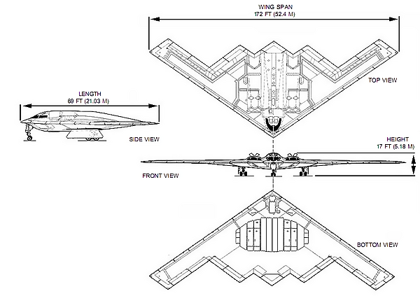 Б-2 или «Дух» первый современный серийный тяжёлый самолёт со схемой «летающее крыло». Предназначен для прорыва плотной противовоздушной обороны (ПВО) и доставки обычного или ядерного оружия. Начало полётов с 1989 года, производство прекращено в 2000 году. В самолёте широко использованы технологии малозаметности: самолёт покрыт радиопоглощающими материалами, создан по аэродинамической схеме «летающее крыло», реактивные струи двигателей экранируются[3]; точное значение ЭПР для B-2 не сообщается, по разным оценкам, это величина от 0,0014[4] до 0,1 м²[5].