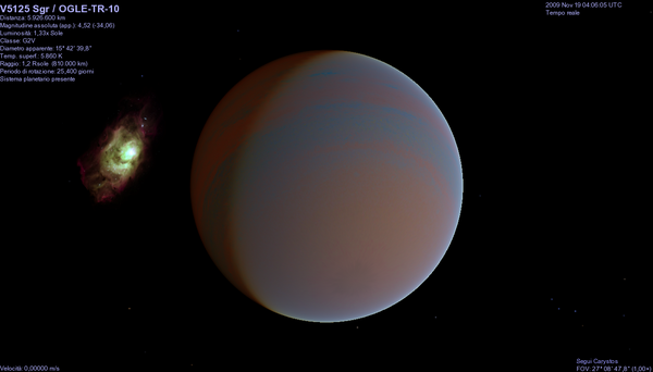 OGLE-TR-10 — переменная звезда[6] в созвездии Стрельца на расстоянии примерно 5000 световых лет от Солнечной системы. Вокруг звезды обращается, как минимум, одна планета[6].