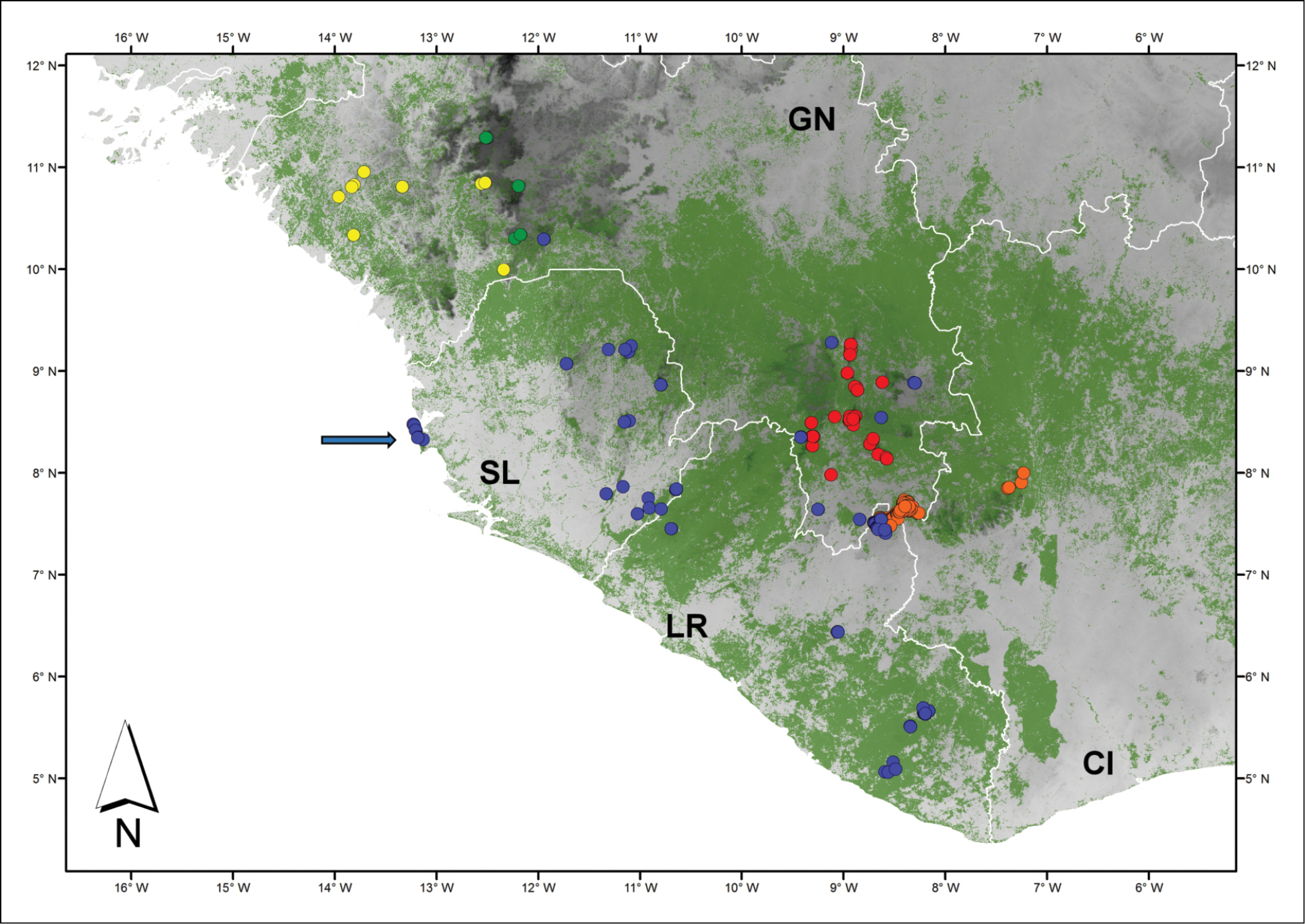 Обитают в холмистых лесных районах Западной Африки — в Сьерра-Леоне, на севере Либерии, на юге Гвинеи и на западном побережье Кот-д'Ивуара, на высотах до 1400 м над уровнем моря[5].