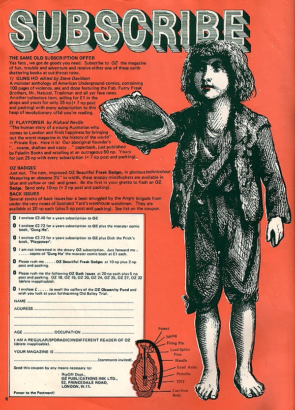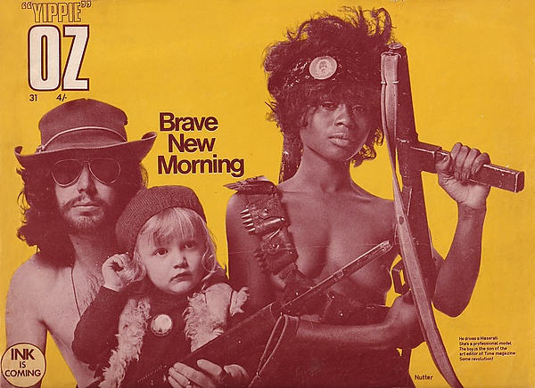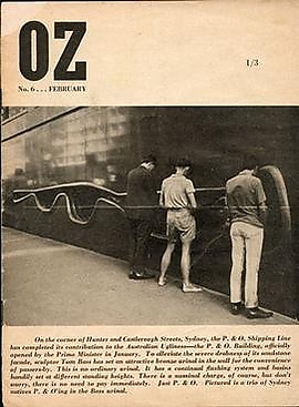 Два других материала в ранних выпусках журнала вызвали гнев полиции Нового Южного Уэльса. Одним из них было непристойное сатирическое стихотворение Мартина Шарпа о молодёжи, вторгшейся на вечеринку, озаглавленное «Слово вспыхнуло вокруг оружия»; другим была фотография на обложке шестого номера Oz (на фото справа), на которой Невилл и другие изображали, как будто справляют нужду в настенный фонтан работы скульптора Тома Басса, установленного ранее на фасаде сиднейских офисов компании P&O и с помпой презентованного премьер-министром Мензисом.