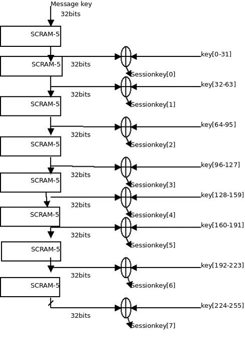 Чтобы получить 256-битную последовательность нужно воздействовать функцией scram-5 восемь раз на 32-битный ключ сообщения. Ключ сеанса получается побитовым XOR, получающегося в результате 256-битной последовательности с основным ключом(рис.3)[3].