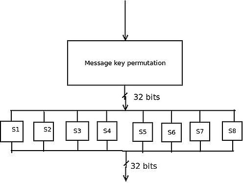 Для генерации ключа сеанса функция скремблирования должна быть спроектирована так, чтобы воздействовать на все биты ключа сообщения на главном ключе. При фиксированном главном ключе изменение битов ключа каждого сообщения должно изменять каждый из битов основного ключа со средней вероятностью 50 % (эффект лавины). Данная функция скремблирования создаётся сетью замещения-перестановки (SPN). Для обеспечения этого 32-битный ключ сообщения вводится в блок перестановок (P-Box) и получается новая 32-битная последовательность. Результирующие 32 бита делятся на 8 четырёхбитных фрагментов, и каждый фрагмент входит в блок замены (S-box4 × 4). Выходы S-блоков объединяются соответственно и создают 32-битную последовательность. Для достижения хорошей диффузии по всем выходным битам путём изменения входных данных, эту операцию необходимо повторить не меньше, чем 5 раз. На рис. 2 показана данная итерационная функция, которая носит название Scram-5[1].