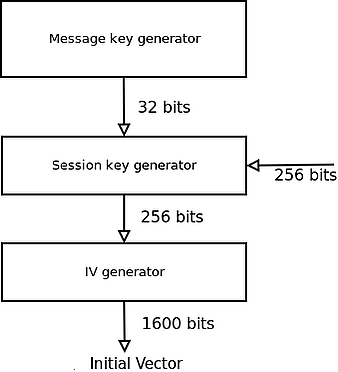 Для этого генерируется сеансовый ключ с ключом сообщения и основным ключом длиной 256 бит. Далее сеансовый ключ расширяется до 1600 бит (начальный вектор). Блок-схема генерации начального вектора показана на рис. 1[1].