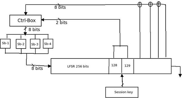 Начальное состояние этого РСЛОС — 256-битный сеансовый ключ, генерирующий восемь битов в любое время. Четыре 8 × 8-битных S-блока встроены в функцию обратной связи РСЛОС, и один из них выбран и используется для соответствующей диффузии ввода-вывода[1].