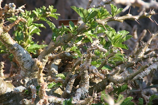 Прилистниковые колючки расположены в раскидистых парах и исходят от небольшой подушки с центральным углублением. Они являются тонкими, жёсткими и раскидистыми. Часто третья колючка отходит проксимально к основанию, а две боковые колючки имеют длину примерно 2,5-3(-4) см. У коротких побегов колючки значительно короче[3].