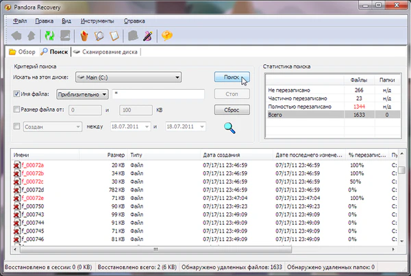 Pandora Recovery предоставляет собой высоконадёжный инструмент, который позволяет пользователям осуществлять поиск с последующим восстановлением удалённых файлов как в отформатированных дисках (локальных, сетевых или переносных[1]) файловой системе NTFS (и других[2]) или повреждённых носителях, так и после удаления файлов из Корзины.