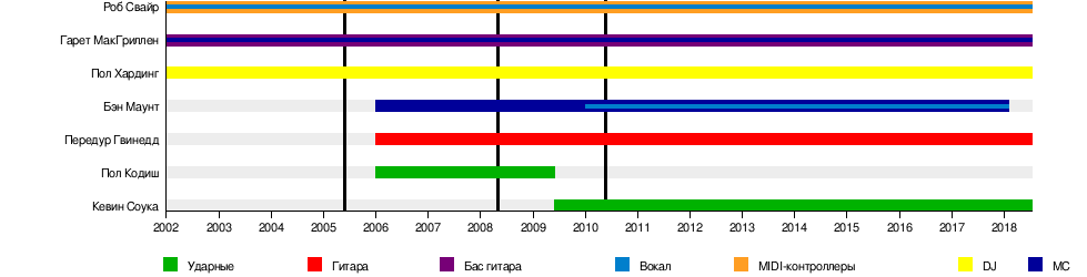 - Гарет МакГриллен (Gareth McGrillen) — бас-гитара, бэк-вокал, DJ, (2002—настоящее время с 2017 выполняет ещё и роль МС в группе)