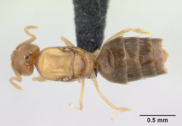 Мелкие муравьи желтовато-коричневого цвета, длина около 2 мм (самки вдвое крупнее). Усики 11-члениковые. Нижнечелюстные щупики состоят из 6 члеников, а нижнегубные из четырёх сегментов. Жало отсутствует и для человека не опасен. Однако он разводит равнокрылых насекомых, сосущих соки из растений и распространяющих болезни растений, чем может приносить вред в инвазивных регионах[3][5].