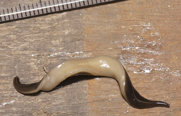 Это относительно большой плоский червь, от 40 до 65 мм в длину и около 4—7 мм в ширину. Его тело, впрочем, довольно плоское и имеет толщину менее 2 мм. Оба конца тела заострены, но передняя часть, где находится голова, острее задней[5]. На кончике головы имеются два глаза[6]. Цвет тела тёмно-коричневый сверху, со светлой полоской по центру. Нижняя поверхность бледно-серая[5].