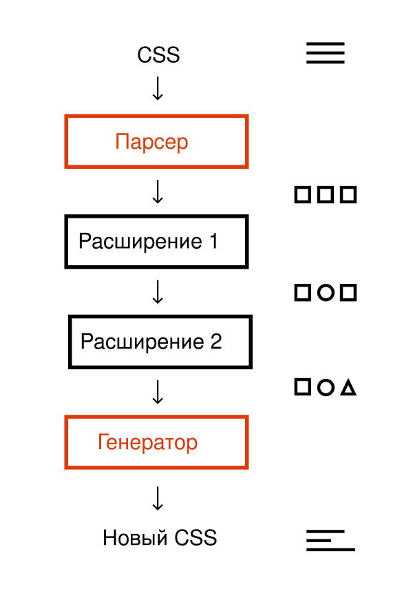 Все полезные функции предоставляются расширениями — небольшими программами, которые работают с деревом объектов. После того, как ядро преобразует CSS-строку в дерево объектов, расширения по очереди анализируют и изменяют это дерево. Затем ядро PostCSS генерирует новую CSS-строку по дереву, которое было изменено расширениями.