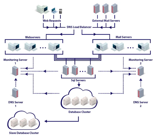 В каждом центре обработки данных используются: балансировка нагрузки между веб-, почтовыми и SQL- серверами, резервный источник питания, жесткие диски с полным шифрованием, а также Linux и другое программное обеспечение с открытым исходным кодом[10]. В декабре 2014 года ProtonMail присоединился к интернет-регистратору RIPE NCC, чтобы иметь возможность лучше контролировать окружающую интернет-инфраструктуру[11].
