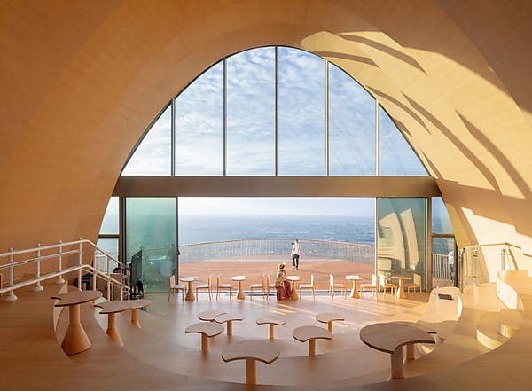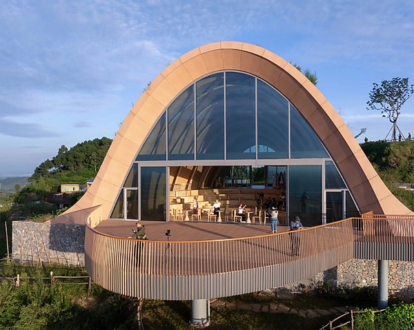 Здание имеет телескопическую форму, расширяющуюся в сторону панорамного остекления. Основной материал — дерево, что является редким примером масштабного использования древесины в современном китайском строительстве.