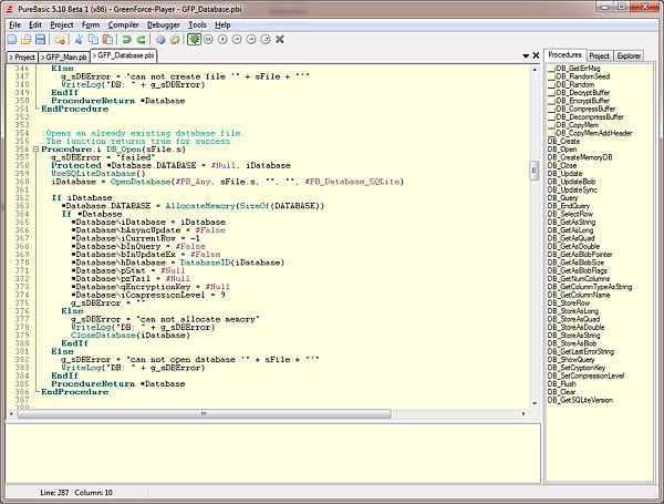 Многопроходный компилятор PureBasic состоит из переводчика кода в ассемблер, ассемблера (FASM) и компоновщика. У PureBasic также есть и неплохой отладчик. Так как в компиляторе присутствует ассемблер, есть возможность в коде использовать ассемблерные вставки. Поддерживает наборы символов ASCII и Unicode.