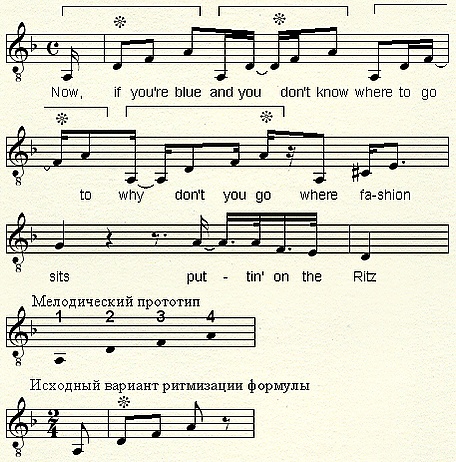 Своеобразие песне придаёт вторая часть (отдел B в полной версии формы), каждая строфа которой заканчивается рефреном Puttin' on the Ritz. Здесь простейшая мелодическая фигура (квартсекстаккорд в тесном расположении) проводится четырежды (см. нотный пример), каждый раз иначе ритмизованная. Первое проведение устанавливает исходный мелодико-ритмический вариант («точку отсчёта», ноты фигуры синхронизированы с долями метрической сетки). Все последующие проведения фигуры ритмически сокращены (три восьмых вместо четырёх), при этом метрические акценты падают на разные ноты фигуры: во втором проведении — акцент на d (№ 2 на схеме мелодического прототипа) со смещением на шестнадцатую (синкопа), в третьем — на f (№ 3), в четвёртом — на a (№ 4). Изобретательная мелодико-ритмическая игра создаёт впечатление сбоя в тактовом метре (так называемая ложная полиметрия), который в действительности строго выдерживается на всём протяжении пьесы.