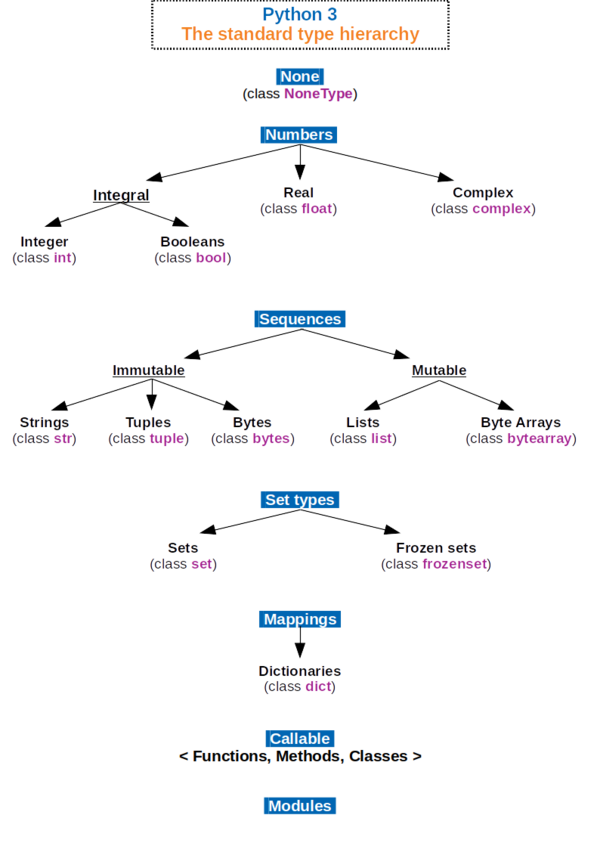 Python поддерживает динамическую типизацию, то есть тип переменной определяется только во время исполнения. Поэтому вместо «присваивания значения переменной» лучше говорить о «связывании значения с некоторым именем». К примитивным типам в Python относятся булевый, целое число произвольной точности, число с плавающей запятой и комплексное число. Из контейнерных типов в Python встроены: строка, список, кортеж, словарь и множество[47]. Все значения являются объектами, в том числе функции, методы, модули, классы.