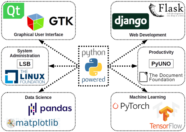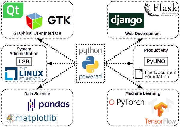 Будучи языком общего назначения Python применим почти во всех сферах деятельности. Фактически Python используется практически любой солидной компанией тем или иным образом как для выполнения текущих задач, так и в тестировании, администрировании или в разработке программных продуктов[184].