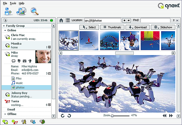 Qnext — программа, написанная на Java. Работает на различных платформах (Mac, Microsoft Windows, Linux). Позволяет передавать любые файлы, как напрямую, так и в режиме FTP, организовывать музыкальные зоны и фото-зоны. Имеет функции чата и электронной почты.