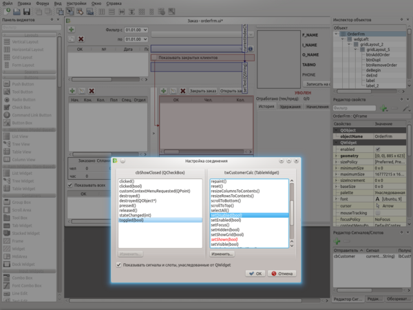 Qt Designer позволяет создавать графические интерфейсы пользователя при помощи ряда инструментов. Существует панель инструментов «Панель виджетов», в которой доступны для использования элементы интерфейса — виджеты, такие как, например, «выпадающий список» ComboBox, «поле ввода» LineEdit, «кнопка» PushButton и многие другие. Каждый виджет имеет свой набор свойств, определяемый соответствующим ему классом библиотеки Qt. Свойства виджета могут быть изменены при помощи «Редактора свойств». Для каждого класса свойств виджета существует свой специализированный редактор[3]. Характерной особенностью Qt Designer является поддержка визуального редактирования сигналов и слотов. Так, например, можно связать сигнал, генерируемый по переключению состояния виджета CheckBox со слотом отвечающим за доступность другого виджета.