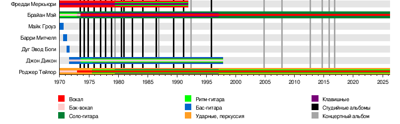 - Фредди Меркьюри — ведущий и бэк-вокал, клавишные, фортепиано, иногда акустическая гитара (1970—1991; умер в 1991 году)