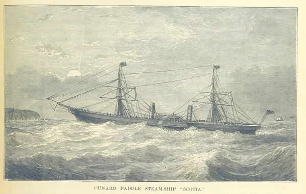 RMS Scotia имела две высоких на тот момент, трубы. Это был последний лайнер, который имел большое водяное колесо в истории Кунард Лайн. Она также имела паруса и двигатели.