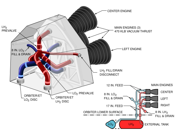Окислитель от внешнего топливного бака поступает в орбитальный аппарат на стыковочное соединение челнока с внешним баком и затем в главную систему подачи жидкого кислорода челнока. Там она разветвляется на три канала, по одному для каждого двигателя. В каждой ветви предварительный клапан жидкого кислорода должен быть открыт, чтобы обеспечить поток к бустерному ТНА окислителя (англ. Low Pressure Oxidizer Turbopump, LPOTP).