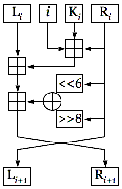 Алгоритм за один проход обрабатывает два 32-разрядных беззнаковых числа (unsigned long) a и b, то есть 64-битный блок. Длина ключа в 32-разрядных числах — kw, r — раунд.