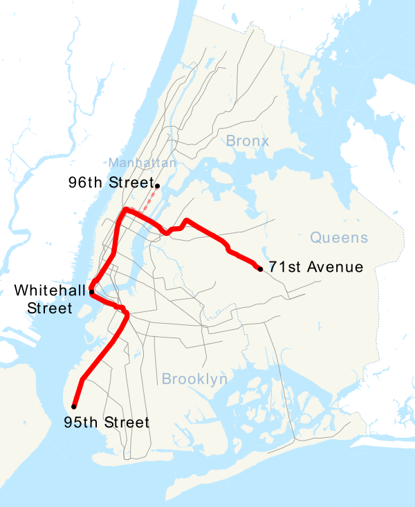 Форест-Хилс — 71-я авеню (круглосуточно, кроме ночи) Уайтхолл-стрит — Саут-Ферри (ночью) Бей-Ридж — 95-я улица |
