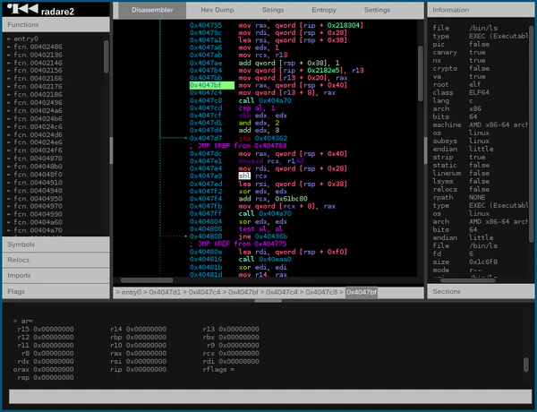 Radare2 (также известный как r2) — свободный кроссплатформенный фреймворк для реверс-инжиниринга, написанный на Си, который включает дизассемблер, шестнадцатеричный редактор, анализатор кода и т. д[2]. Используется при реверсе, отладке вредоносного ПО и прошивок[3][4].