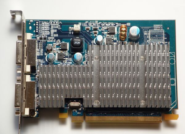 Серия Radeon HD 2400 основывается на ГП RV610. Он обладает 180 миллионами транзисторов и произведен по 65-нм технологическому процессу. Серия Radeon HD 2400 использует 64-битную шину памяти.[16] Площадь чипа составляет 85 мм².[20] Официальный дизайн платы предусматривает только пассивное охлаждение чипа (радиатор вместо вентилятора). Ядро обладает 16 Кб унифицированного вершинного/текстурного кэша в отличие от выделенного вершинного кэша и L1/L2 текстурного кэша, используемых в более производительных моделях.