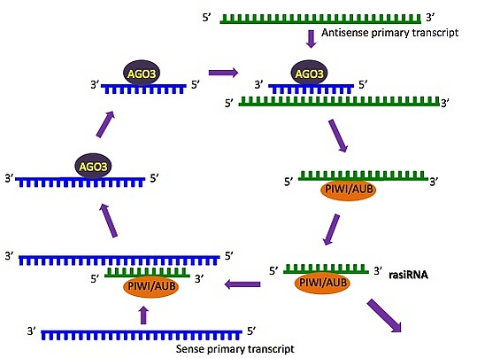 Предполагается, что источником rasiРНК служат двуцепочечные РНК, образующиеся при отжиге смысловых и антисмысловых транскриптов мобильных генетических элементов. Биогенез rasiРНК независим от Dicer, однако для него необходимы белки семейства Argonaute: Ago3, Piwi и Piwi-подобный белок Aubergine (Aub). Путь образования rasiРНК представляет собой цикл пинг-понг. Сначала уже существующая молекула rasiРНК в комплексе с белками Piwi/Aub связывается с первичным транскриптом мобильного элемента или повторяющихся последовательностей (отсюда название этой группы РНК[2]) и вызывает отрезание фрагмента транскрипта. Один из оставшихся фрагментов связывается с белком Ago3 и вместе с ним связывается с антисмысловым первичным транскриптом, катализируя отрезание фрагмента от него. Этот фрагмент далее связывается с Piwi/Aub и может далее разрушать смысловые вредоносные транскрипты и одновременно обеспечивать образование новых rasiРНК (пинг-понг-цикл). На схеме слева приведена схема этого процесса с указанием процессинга 5'-конца rasiРНК, однако путь процессинга 3'-конца остаётся неизвестным[7].