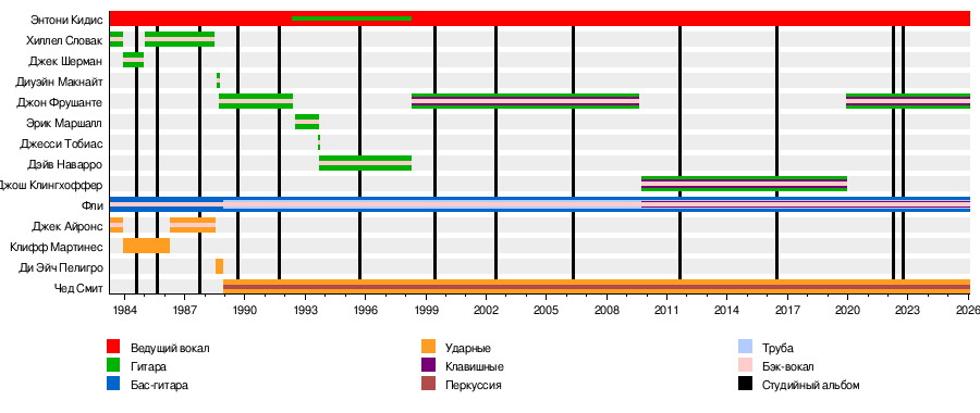 Кидис использует несколько вокальных стилей. В Blood Sugar Sex Magik он в основном читает рэп. Дополнив его традиционным вокалом, он помог группе создать законченный стиль. Начиная с Californication, музыканты стали использовать меньше речитатива в своих песнях (в By the Way было всего лишь два трека). Поздний стиль Кидиса был выработан в ходе длительных тренировок[77]. Стиль Хиллела Словака полностью основан на блюзе и фанке. На творчество Словака повлияли такие хард-рок-исполнители, как Джими Хендрикс, Kiss и Led Zeppelin. Его музыкальный метод был основан на импровизации, стиль который обычно используется в фанк-музыке[141]. Он также отличался агрессивной манерой игры; он обычно играл с такой силой, что его пальцы могли «распасться на части»[141]. Кидис наблюдал, что Хиллел эволюционировал с момента игры в What Is This?. Словак принял более текучий стиль со «знойными» элементами в противовес его первоначальной хард-рок-технике[142]. В The Uplift Mofo Party Plan Словак экспериментировал с разными жанрами вне традиционной фанк-музыки, включая регги и спид-метал. Его гитарные риффы всегда использовались как основные в песнях группы, в то время как остальные писали свои партии, чтобы дополнить его работу. Его мелодичный рифф в песне «Behind the Sun» вдохновил группу на написание «хорошеньких» песен с акцентом на мелодию[16]. Кидис описывает песню «как чистое вдохновение Хиллела». Словак также использовал talk box в таких песнях, как «Green Heaven» и «Funky Crime», в которых он будто бы пел в трубу, в то время как играл, создавая психоделические эффекты[143].