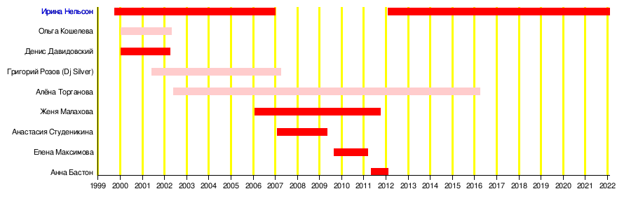 | 1. | Ирина Нельсон | 1999 — 2007; 2012 — по н.в. | Анастасия Студеникина | |
