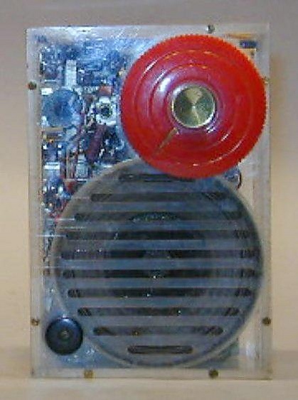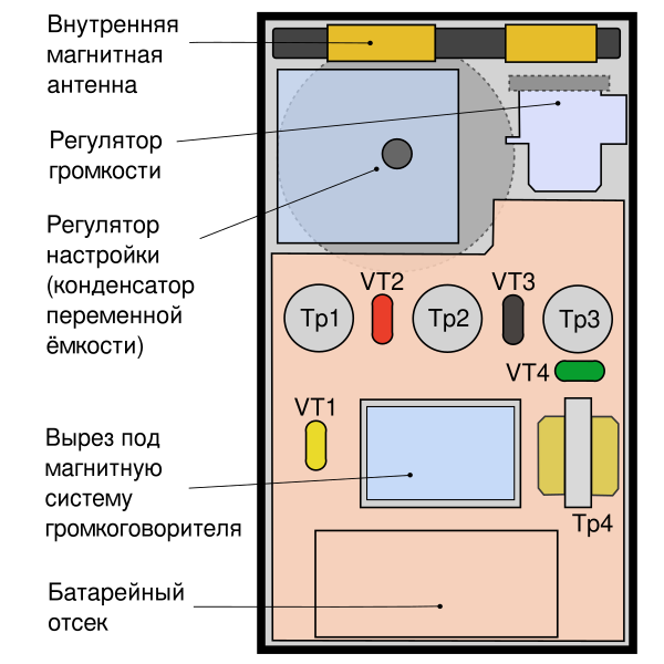 Приёмник собран на печатной плате. Элементы, размещённые на печатной плате, скомпонованы линейно (от входного каскада на VT1 к выходному трансформатору Тр4), полукольцом вокруг выреза под магнитную систему громкоговорителя[51]. Корпуса транзисторов каждого каскада и расположенные рядом с ними конденсаторы окрашены в особые цвета для упрощения сборки платы[2]. Все четыре транзистора включены по схеме с общим эмиттером с трансформаторными межкаскадными связями. Громкоговоритель, потенциометр регулятора громкости, конденсатор переменной ёмкости и магнитная антенна на ферритовом стержне крепятся непосредственно к корпусу и соединены с платой навесным монтажом[51].