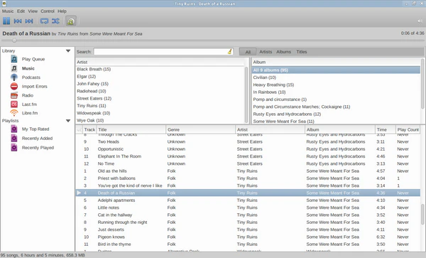 - Поддерживается воспроизведение музыки с различных цифровых носителей. Rhythmbox поддерживает потоковое интернет-радио и подкасты;