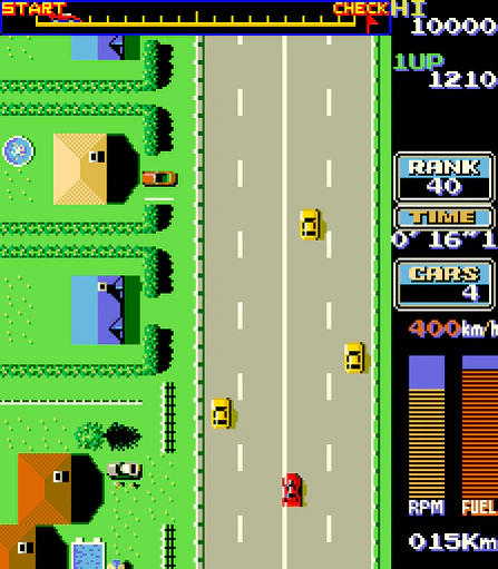 Количество машин трафика уменьшено до четырёх — жёлтые, голубые, красные легковые машины, и грузовик. В начале первого уровня машина игрока находится на стартовой позиции с 7-ю голубыми машинами. Как и в версии для MSX, они являются обычными машинами трафика. Жёлтые машины движутся без смены полосы, голубые и красные могут менять полосу.